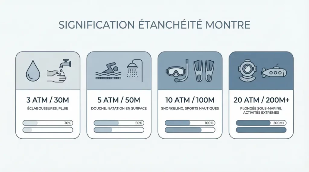 | 30m | 3 ATM | Résiste à 3 bars statiques | Éclaboussures, pluie uniquement |
