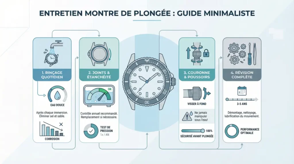 Automatique ou quartz, l’entretien de l’étanchéité reste identique. Les joints doivent être changés tous les 2 à 3 ans, le rinçage après immersion est obligatoire, et les tests d’étanchéité sont indispensables.