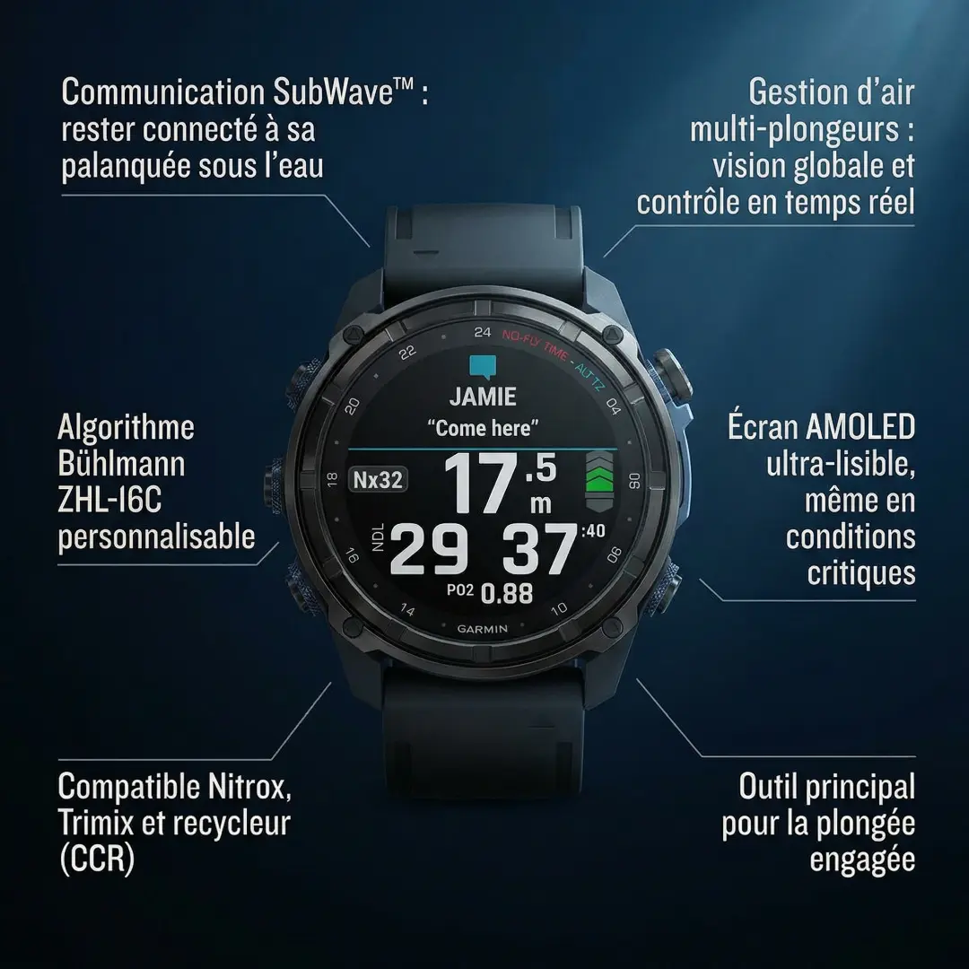 L’ordinateur de plongée format montre le plus performant jamais conçu par Garmin. Profitez d’un écran AMOLED ultra-lumineux, d’une étanchéité certifiée à 200 mètres et de la révolutionnaire technologie SubWave™ pour communiquer avec vos binômes sous l’eau. Un outil sans compromis pour les plongeurs exigeants et les professionnels.